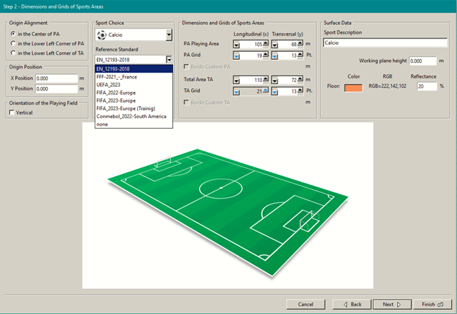 - the playing area by choosing the type of sport, the standard to be applied and the class. The program will show the dimensions of the area and the corresponding calculation grids accordingly. Then, both, the color of the surface and the height of the work plane are defined