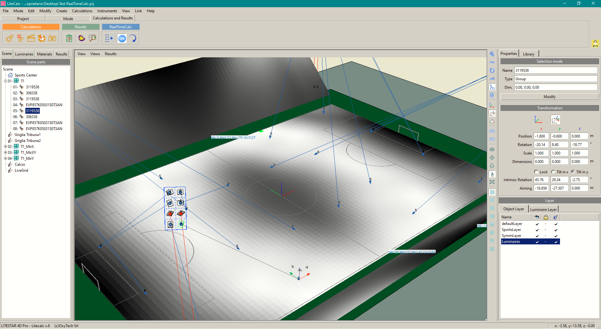 - desplazarlas: lo cual permite colocar las luminarias en posiciones irregulares como, por ejemplo, sobre las cubiertas de las gradas, incluso en líneas no rectasm que siguen formando parte de un grupo de luminarias