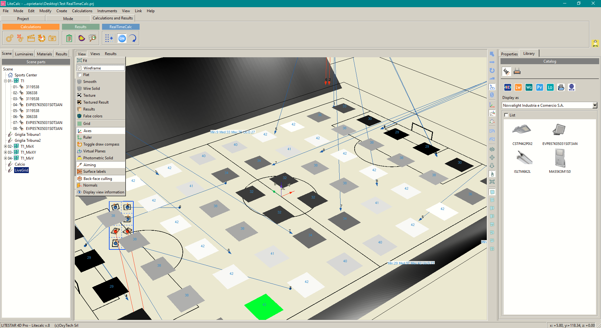 Una vez definidas las áreas general y de juego con dimensiones y cuadrículas, y la torre de iluminación con sus luminarias, es posible enfocar las luminarias seleccionando la función adecuada y la luminaria que se desea enfocar a partir de la cual desplazar el enfoque por el área.